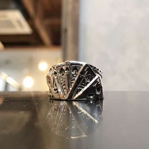 手札をのぞき込んでいるようなデザインが印象的なトランプカードのリング。