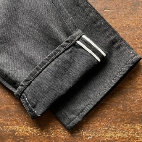 経緯ともに硫化染色の糸を使用した、深みのあるブラックジーンズです。