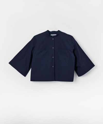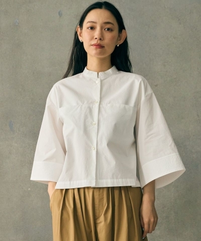 襟と袖口に細かいステッチと胸元のポケットのデザインがアクセントのショート丈のシャツ。
