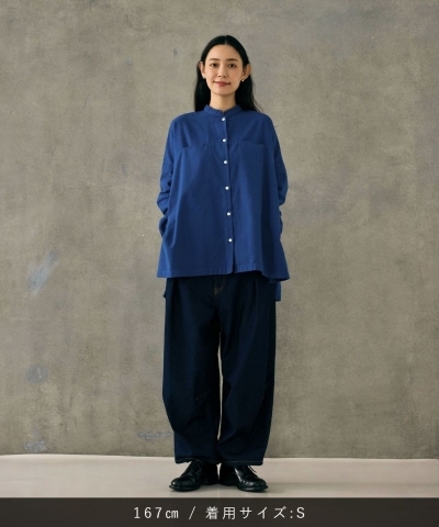 スタンドカラーと胸ポケットがアクセントを添え、さりげないエレガンスを漂わせます。