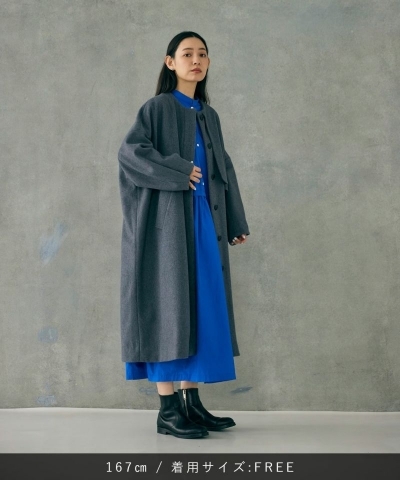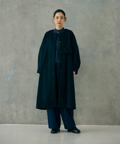 ノーカラーですっきりとした首元はブラウスやタートルネックなどインナーデザインを選ばずにスタイリングを楽しめます。