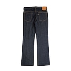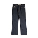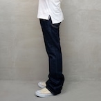 100年以上の歴史を持つ広島県の染色工場で、ロープ染色されたデニムを使用。インディゴ染料で15回ロープ染色を施した濃色デニムに硫化染色を加え、深みのある濃色インディゴが特徴です。シルエットはウエストから膝にかけて細く、裾に向かって緩やかに広がるブーツカットスタイル。脚のラインを美しく見せる効果があり、ブーツはもちろん、スニーカーや革靴とも相性抜群。普段のジーンズよりワンランク上品な着こなしが楽しめるデザインです。ジッパーには、特に人気の高い「42」の刻印が入ったタロンジップを採用しています。