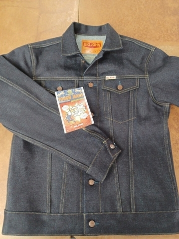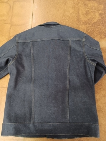 自立してしまう程肉厚な23ozセルヴィッチデニム。タテヨコ共に3番手という極太糸を使用した、なんとも男らしいGジャン!!