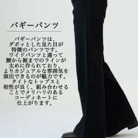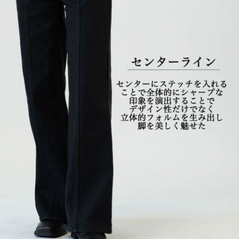 ヒップや太ももに余裕をつくり、裾にかけて広がっていくシルエットを設計