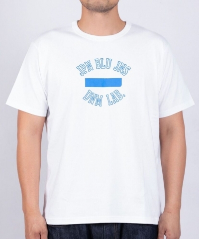 JAPAN BLUE JEANSのブランドネームをプリントしたカレッジTシャツ。