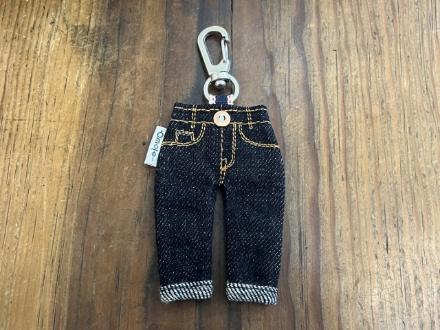 バックポケットに愛らしい“おもとり”の刺繍が施された、ミニジーンズ型キーホルダーの再入荷です。