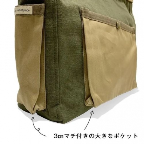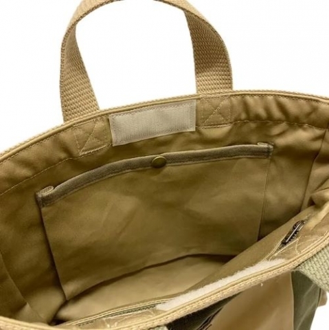 カーキ部分にはキャンバス生地、ベージュ部分にはバックサテン生地を使用。