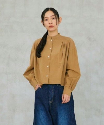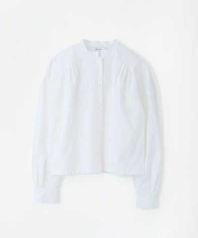 肩のプリーツや袖のタックが立体感を生む、個性のあるデザインに仕上げたシャツ。