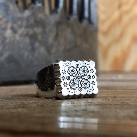 60年代のヴィンテージバンダナから着想を得て製作された、RIVULETシリーズを代表する印台リング。ヴィンテージバンダナの中でもコアな人気を誇るクッキー柄。そのモチーフであるペイズリーや草花を大胆に彫刻しリング全体でクッキー柄バンダナを表現しています。遊び心あふれるポップなデザインは、経年変化によるヴィンテージ感が加わることでさらに魅力を増すよう意図してデザインされています。裏抜きなしで仕上げたシルバー925特有の重厚感と心地よい装着感も魅力。紳士の象徴である印台リングに遊び心を添えた、大人の余裕を映すアクセサリーです。