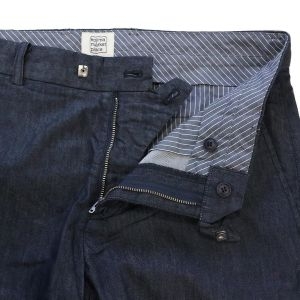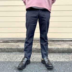 少し艶のあるきれいめなデニム生地を使用したメンズのスラックスパンツ。