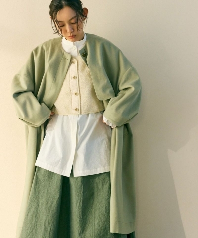 左胸のガンパッチがさりげないアクセントになった、ノーカラーのロングコート。