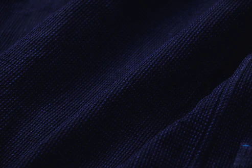 このカバーオールは、経糸にインディゴ、緯糸に黒糸を用いることで、奥行きのある深い色味を表現したオリジナルファブリックを使用しています。刺子のような織りで、生地表面が細かなキューブ状に立体的に見えるのが大きな特徴です。独特の凹凸感がありながら、12ozらしい柔らかさも併せ持ち、着始めから心地よく馴染む風合いに仕上がっています。